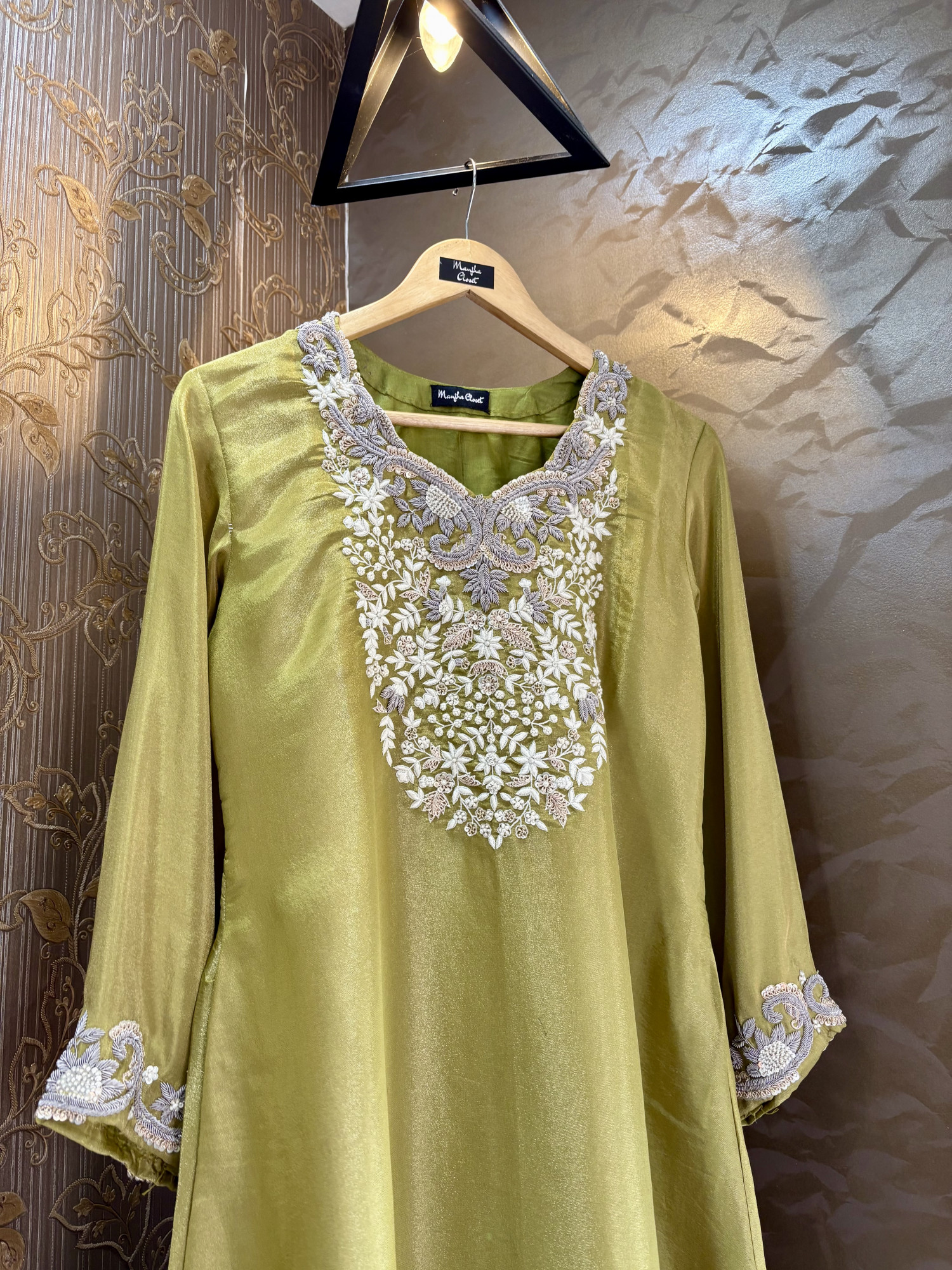 Intricate hand dabka and fine thread embroidery on the yoke and sleeves, showcasing delicate craftsmanship and traditional detailing.