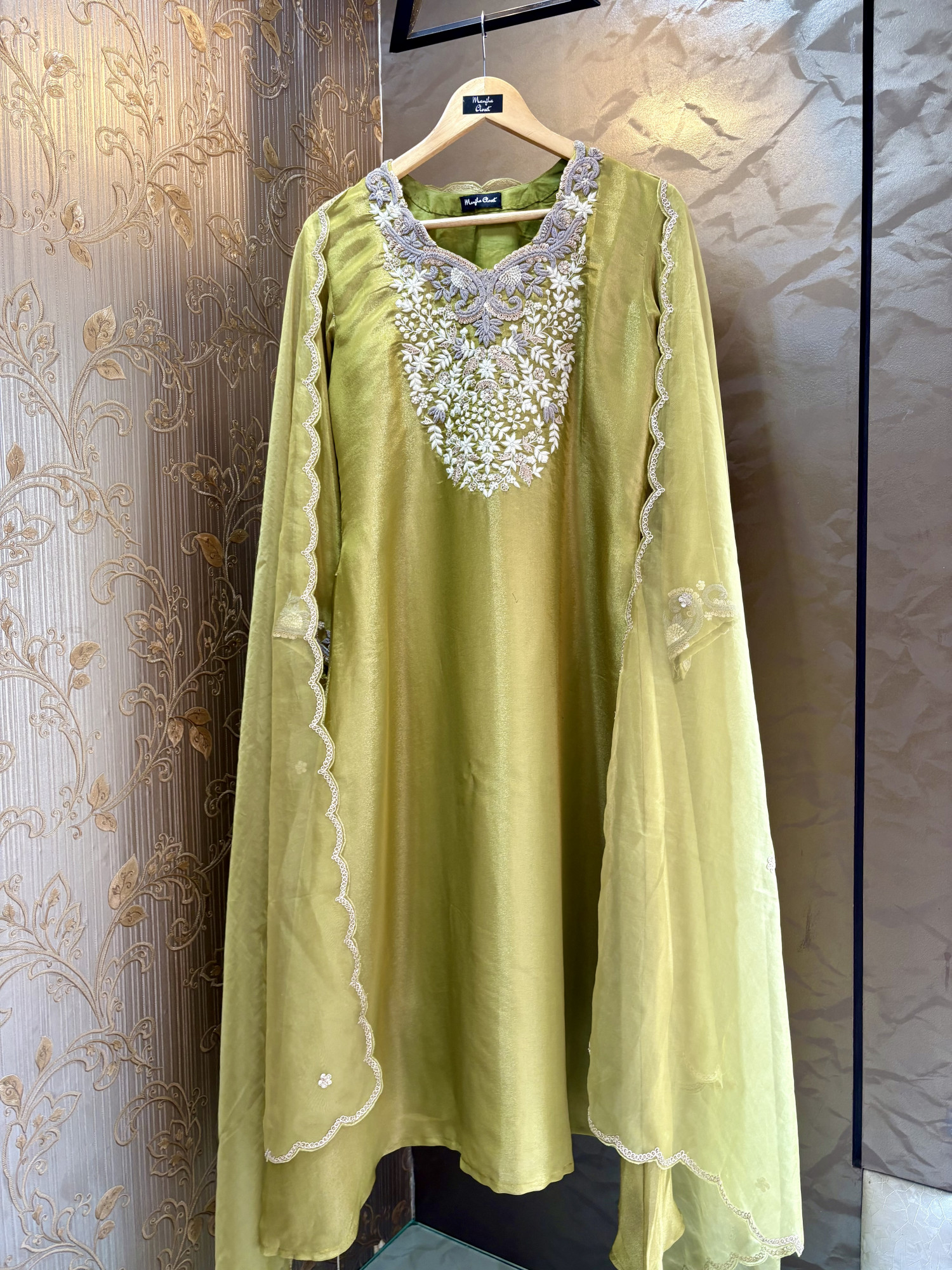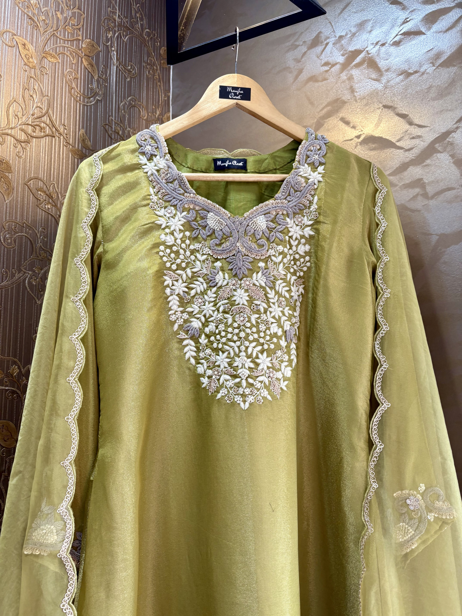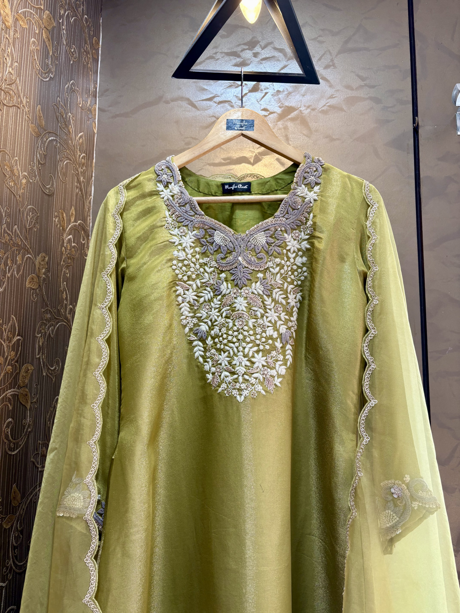 Lightweight organza dupatta that adds an airy elegance and complements the rich texture of the tissue silk ensemble.